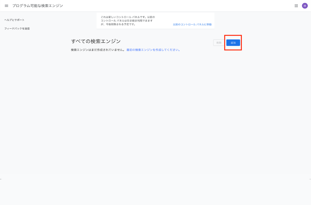 「すべての検索エンジン」と表示されているページより、「追加」ボタンをクリックして進みます。