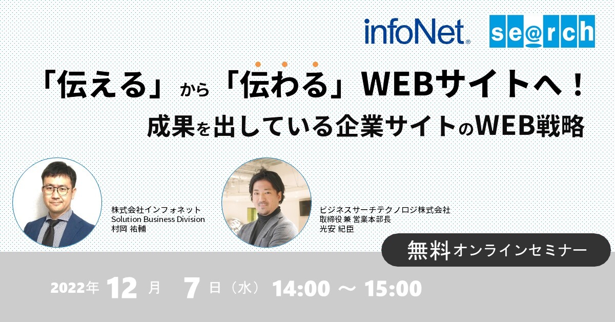 本セミナーでは、自社の魅力を効果的にアピールするためのWEB戦略について、WEBサイト構築で実績豊富なインフォネットとサイト内検索のビジネスサーチテクノロジが事例を交えてお話します。